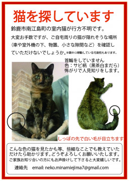 迷子になって1ヶ月です。猫砂をキッチンの水切り袋に入れて、小さめの声で名前を呼びながら歩いていたら、公園の中から小声で鳴く声が聞こえて、探してみたら発見できました!