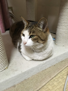 白地に茶色と黒の縞模様です。よく鳴きます。