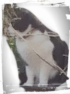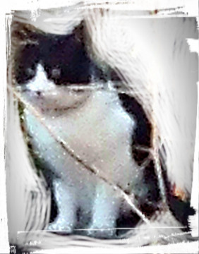 白黒ハチワレ、綺麗な毛並みで鈴がついている赤い首輪をしています。