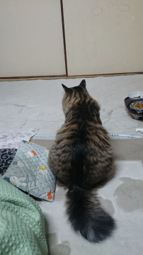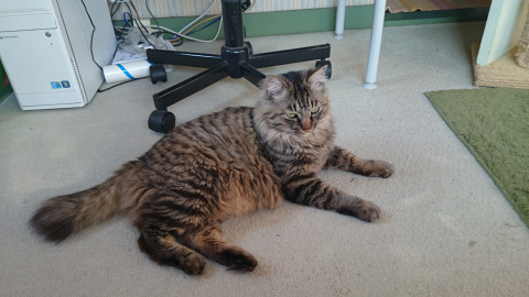 半長毛のキジトラ。フサフサ、モコモコしています。歩いているときのフォルムが遠目だとタヌキそっくりです。しっぽが半端な長さで、太くてフサフサしています。目は緑色。とても臆病です。