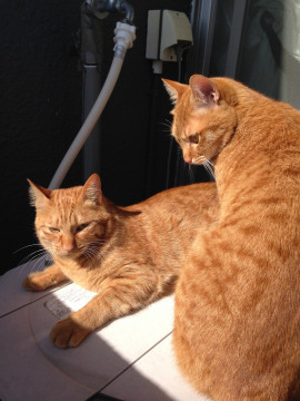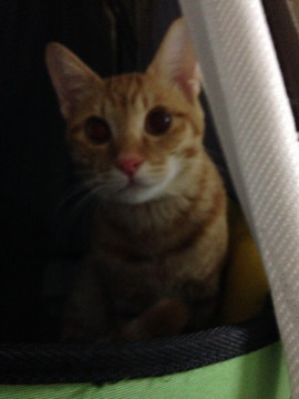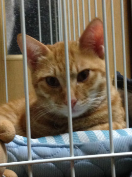茶トラでアゴだけは、白いです。普段は人懐こいですが、家ネコの為、臆病になっていると思われます。