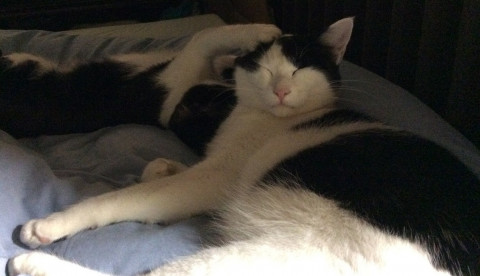 白地に黒のブチで、下半身~しっぽは黒く、しっぽ長めです