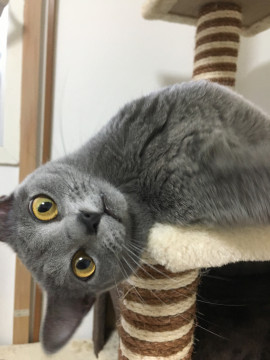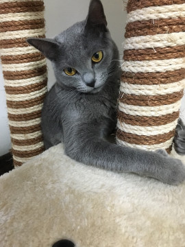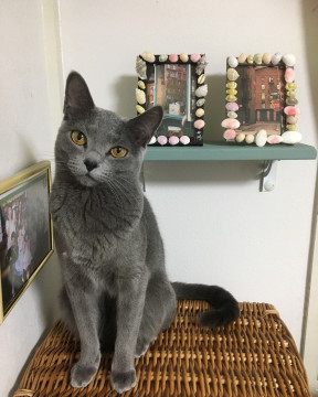 全身グレー、目の色は黄色で細身です。首輪はしていません。人馴れしていますが臆病です。