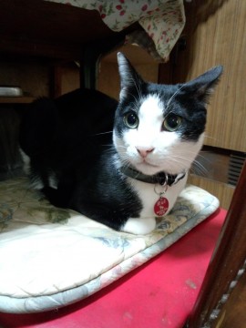 黒と白のはちわれで、背中、しっぽは黒く、胸から腹足にかけて白いです。