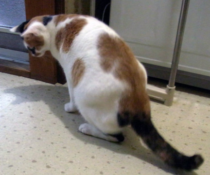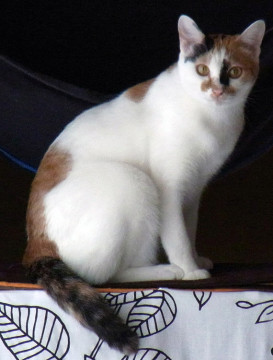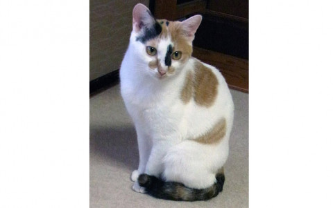 三毛猫。頭、顔、背中、しっぽに模様があります。お腹のあたりはほとんど白。鼻の上に長四角の特徴的な黒い模様あり。しっぽは長く、縞模様。しっぽの先が少し曲がっています。