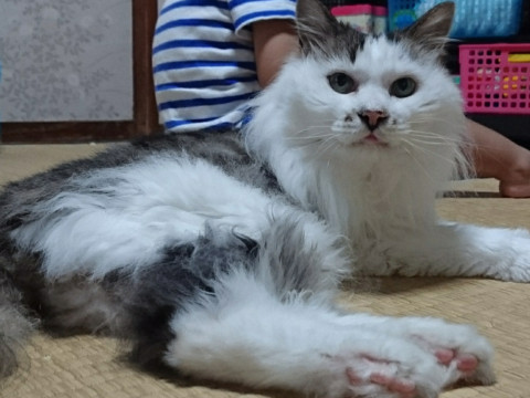 長毛です。耳がほとんど聞こえず、大きな声で鳴きます。足腰も弱ってきていて、速くは走れません。人には慣れていますが、抱っこされるのは嫌いです。