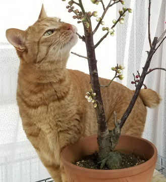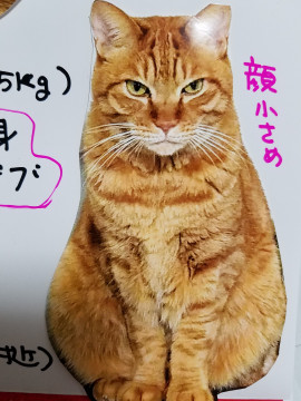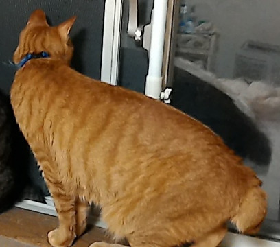 大きな茶とら、うさぎのような短いしっぽ。頭小さめ、下半身デブ、お腹たれています。首輪なし。