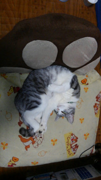サバしろ。耳と目が大きく、ピンクの鼻にほくろがあります。唐草模様の首輪をしています。