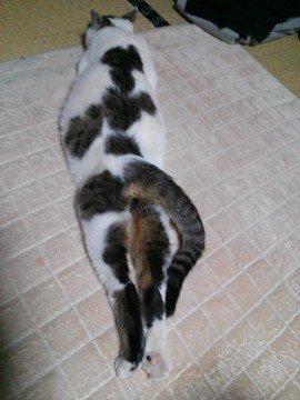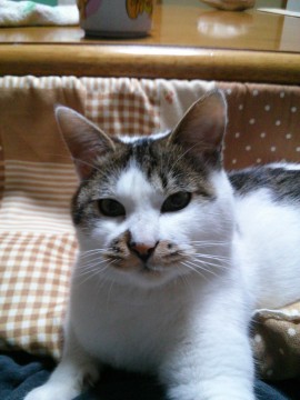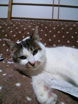 去勢、首輪はしておらず、毛は白地に焦げ茶の斑模様で、口回りが茶色く、目は緑色です。