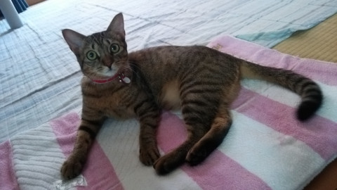 家族が近くにいない時にノラちゃんと網戸越しにケンカして、勢い余って網戸がはずれ、外に出てしまったようです。その時に首輪もはずれてしまいました。