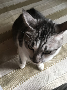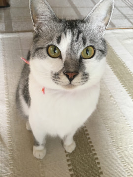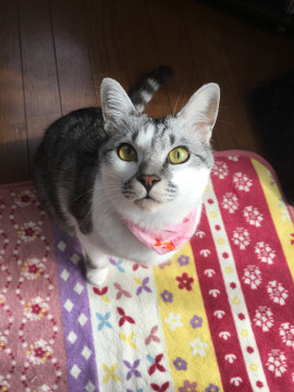 現在首輪は今、水色、青、緑、白の縦縞の首輪をしています。