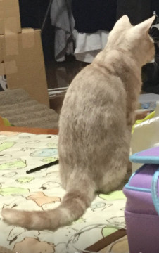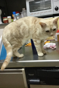 クリーム色のアメショ風・首輪なし・体格は小柄(2.8kg)