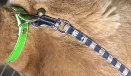 特徴:鈴付き首輪とリードをしています。人なれしています。