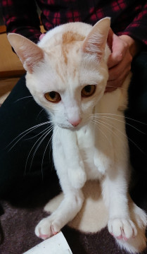 去勢済みオス、お腹真っ白、肉球ピンク、高い声で鳴く、首輪なし、人なつっこい、目がオレンジ
