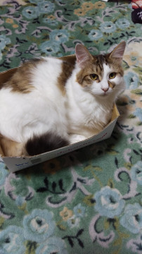 体は半長毛。しっぽはふさふさで先がかぎしっぽになってます。白が多い白キジで顔はハチ割れの様な模様で左のほっぺのあたりにもキジの模様があります。背中にもキジの模様があります、大切な家族です。お心当たりの方はご連絡お願いします。