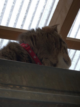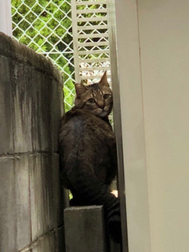 庭に出て お隣りさんとの間の塀にのぼり、裏にまわって