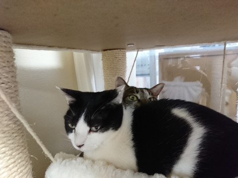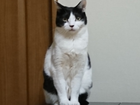 顔はハチワレでしっぽが長く黒です。体は白黒のブチです。目は金色で、高い声で鳴きます。大人しい子です。