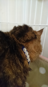 青い布製の首輪をしています