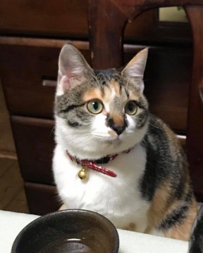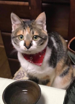 赤のバンダナ風の首輪をしています(外れているかもしれません)。三角の前掛けで鈴がついています。