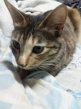 完全室内飼いで2017年10月に自宅前で保護、避妊手術済み。ヤンチャで抱き癖も良く私達夫婦にはなついてますが他の方と接触したことがないため、人懐こいとは限りません。特徴は尻尾が短く5センチ以内。