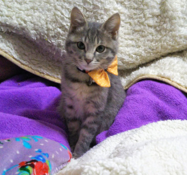 キジトラ♀雑種短毛、グレーの縞模様、すばしっこくてヤンチャで臆病、ふぅちゃんと名前を呼ぶと反応する。鈴の音、ひも、ヘアゴムなどでよく遊ぶ。