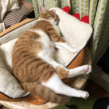 ぽっちゃりした茶白です。しっぽは長くまっすぐでシマシマです。