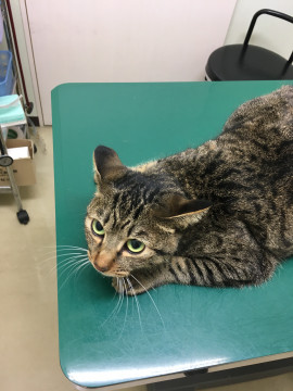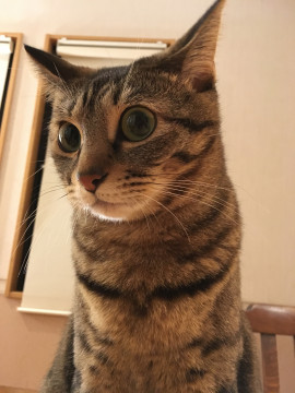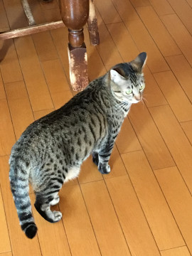 お腹につぶつぶの模様のある茶と黄色のキジトラです。尻尾長いです。