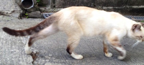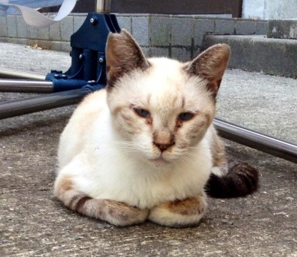 メス、推定1〜2歳。首輪なし。右耳にカットあり。白地に背中に薄い茶色混じり。真っ直ぐ長い尻尾が特徴です。保護して1ヶ月程で迷子になり人馴れはしてません。