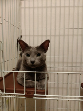 全体はきれいなグレーですが、尻尾に薄く縞模様があります。よく見ると前足寄りの背中の毛に薄く茶色が混じってます