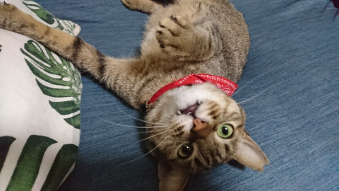 赤いバンダナの首輪をつけており、左耳に傷があります。