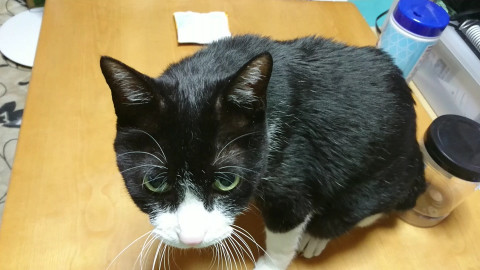 白黒ハチワレ。完全室内飼いで去勢済み。首輪なし。鼻先、腹、手足の先は白く、それ以外は黒。大人しく、かなり人なつっこい性格です。