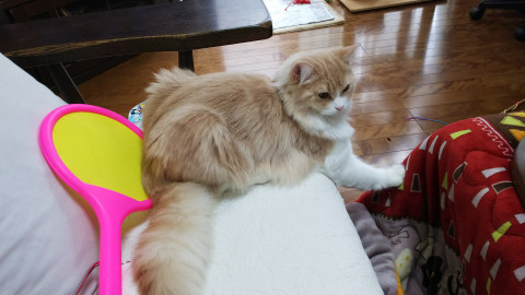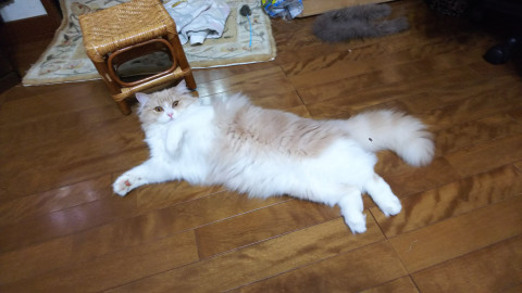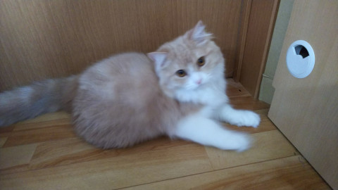 種類は長毛のスコティッシュフォールドですが、立ち耳で顔もあまり丸くなく、パッと見はスコティッシュフォールドらしくありません。