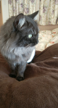 グレーでフサフサの長毛のハイブリッドの猫です。去勢済みで白い首輪に金の鈴がついています。