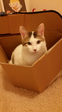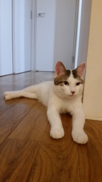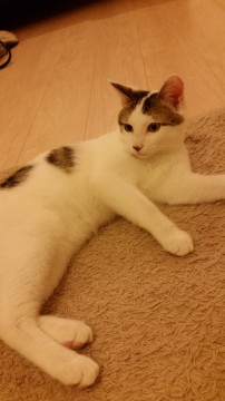 目元にアイラインのような模様があります。尻尾が短いです。首輪に水色の迷子札と緑の鈴がついています。