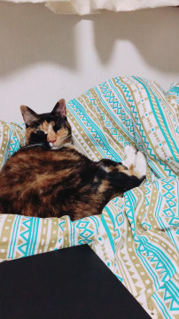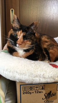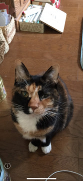 小柄で太っている。毛並みは背中は黒が多めのサビ色で顎の下から白色の三毛猫です。四つ脚にソックスを履いています。尻尾は短く丸まってます。首輪はしていません。おばあちゃんなので、動きがあまり俊敏ではありません。手術をしていて、奥歯がありません。