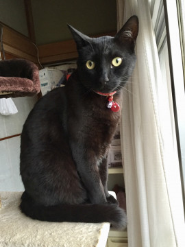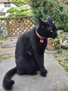 脚も尾も全て他の猫ちゃんに比べて長く、体も細長くスリムな体型です。尾は真っ直ぐで長く、全身が黒で、全ての脚の付け根の内側に少しだけ白い毛があります。去勢済みです。いなくなった当時は5.4㎏ありましたが、痩せている事が予想されます。