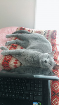 体は細くすらっとしていて尻尾の長いグレーのキレイなロシアンブルーです。
