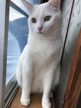 尻尾が長く全身真っ白の白猫です。少し耳が大きめなのが特徴。体重は6㌔ほどありガッチリした体型。