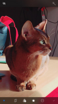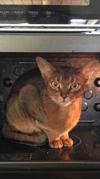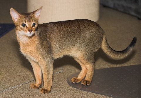 焦げ茶色で、耳が大きくて、小柄な猫です。