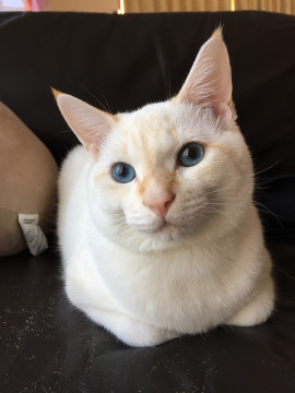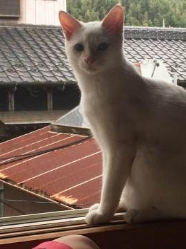 全身白でおでこと尻尾に薄く茶色のトラ柄