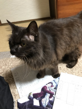 チョコレート色の短足長毛種です。年齢はわかりませんが、我が家に来て6年になります。牙が抜けて右奥に一本残っているだけです。