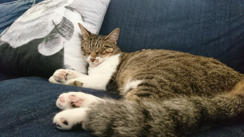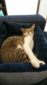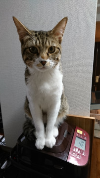 キジ白(茶色ベースに黒の縞々、お腹と手が白)