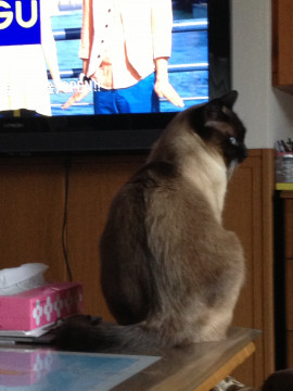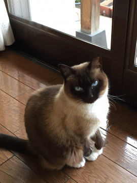 シャムネコ特有の茶色、顔としっぽは濃い茶色です。首輪はしてません。声が高くかわいらしい声で鳴きます