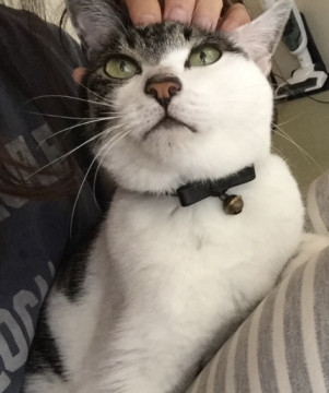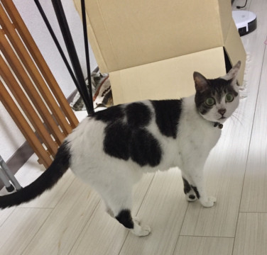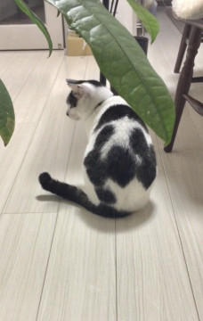 白い体に黒いしっぽ、胴に大きな黒ブチ模様の猫です。