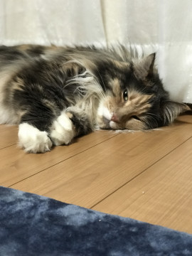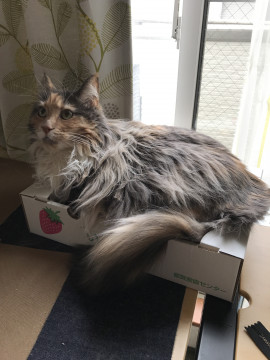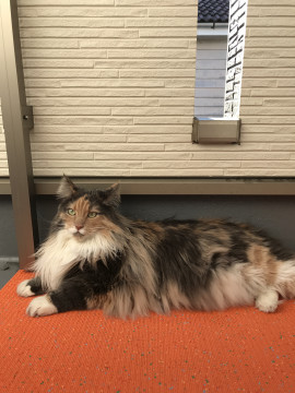 茶色、黒、白のミックスで白いソックスを履いたような脚です。メインクーンで大柄の女の子です。