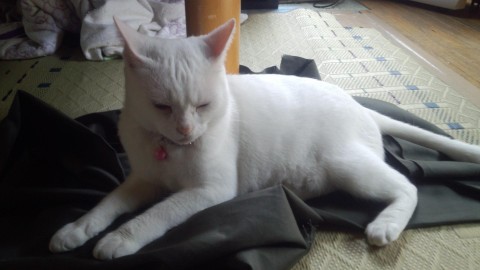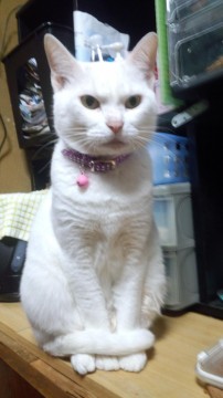 全身真っ白で薄ムラサキの首輪にピンクの鈴がついてます。出産経験がありお腹が少し垂れています。