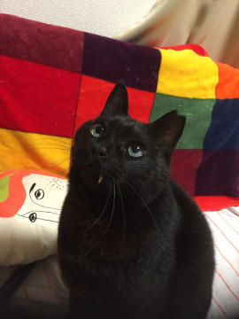 左耳がカットされて桜耳、口を閉じても左のキバが出ています。