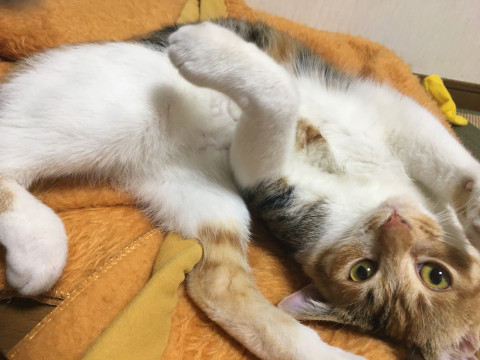とら模様の三毛猫で少し目が大きいほうだと思います。
