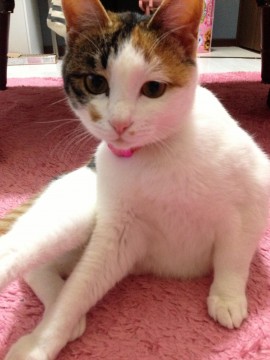 ピンクの首輪をしていて、2月下旬に避妊の手術をしたのでお腹の毛は剃られています。お腹の毛は白色で、尻尾は長くてしま模様です。3月5日の午前11時ごろに高田郷のOKホームセンターさんの駐車場で逃げられました。