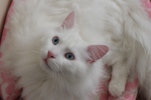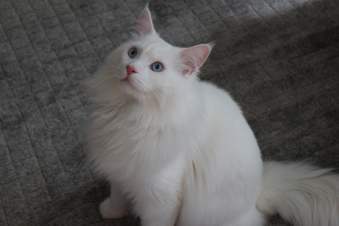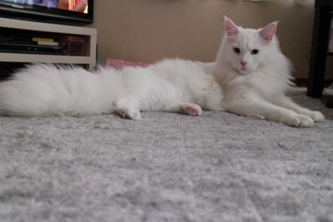 メインクーンの男の子、去勢済、真っ白の子で目はブルー